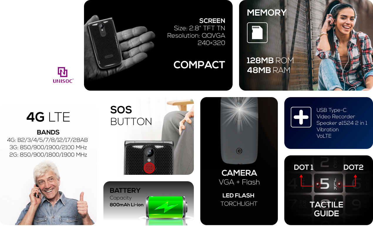 Acceda a funciones como botones táctiles y pantalla extra grande, una interfaz simple y compatibilidad con audífonos que permite a cualquier usuario mantenerse conectado.