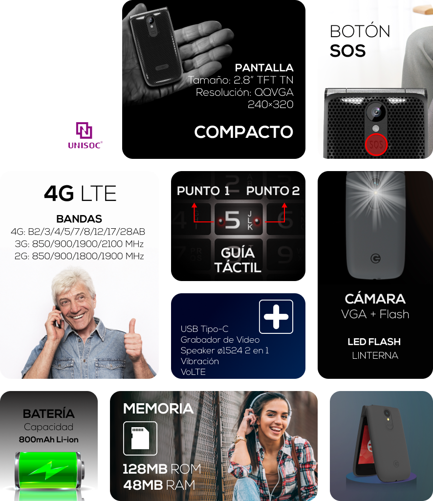 El F11L tiene un botón de llamada de emergencia que se puede programar con el número directo de un familiar o amigo, para obtener ayuda cuando sea necesario.