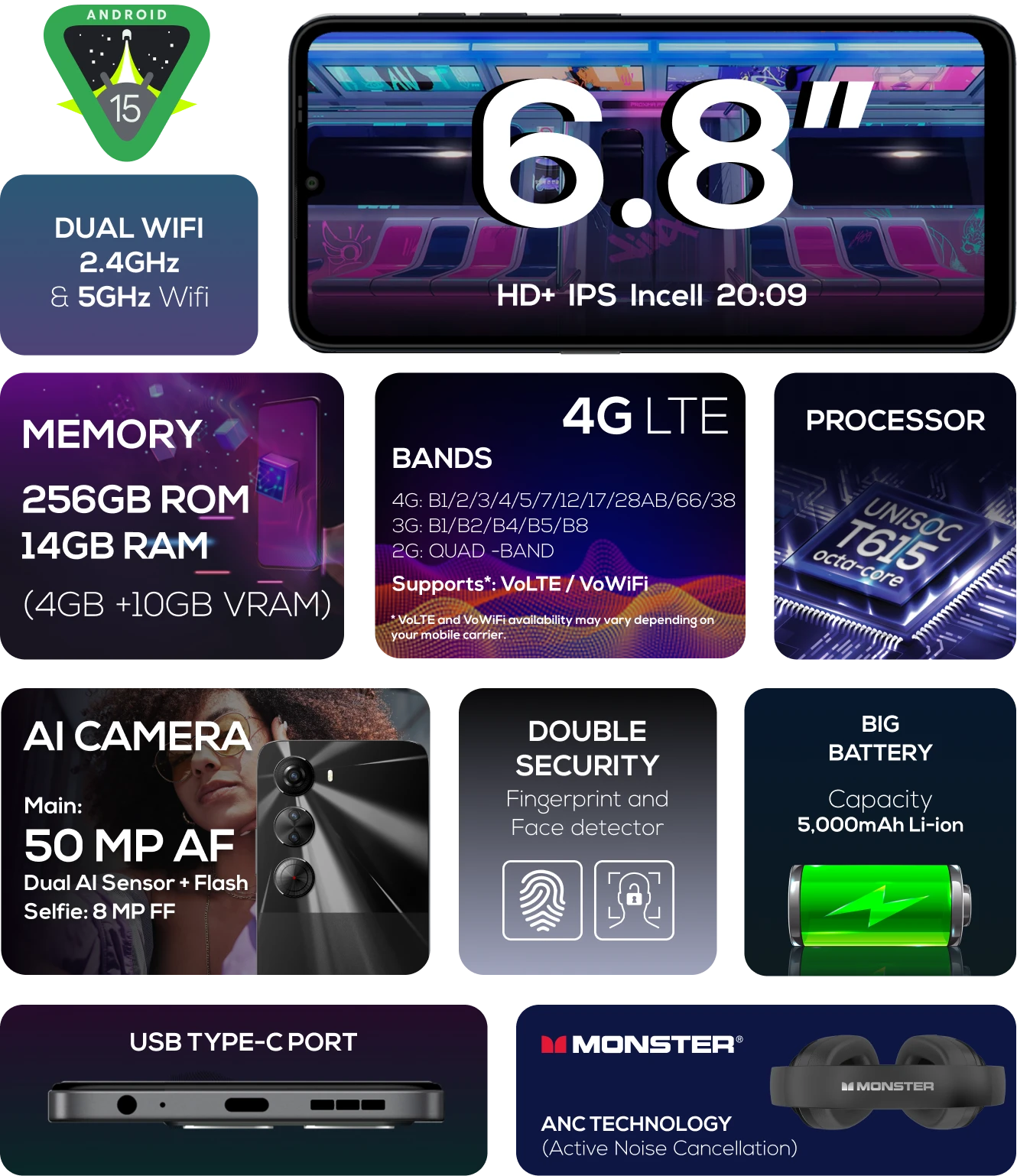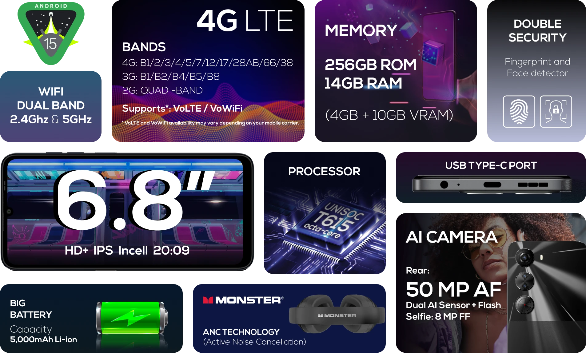 Pantalla: 6.8” HD+ Incell Resolución: V-Notch 720×1600